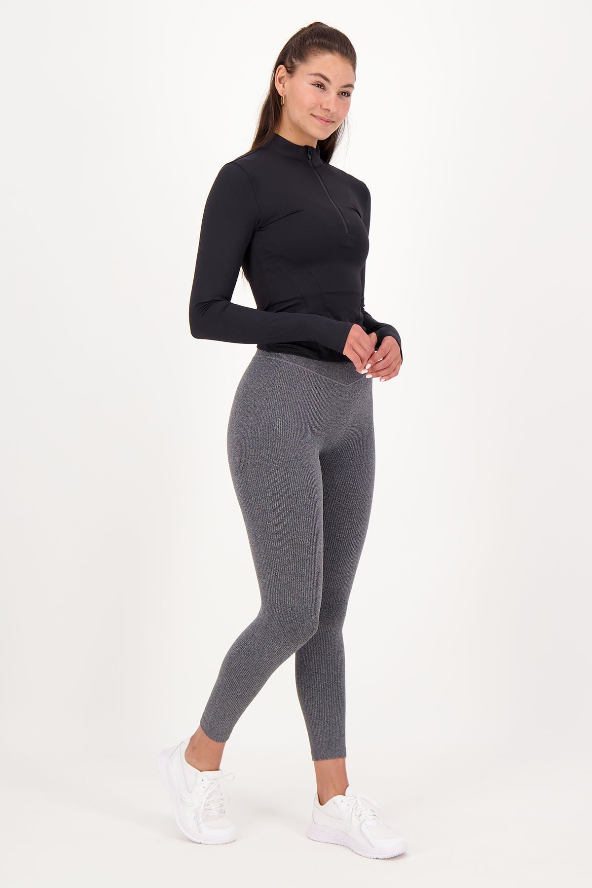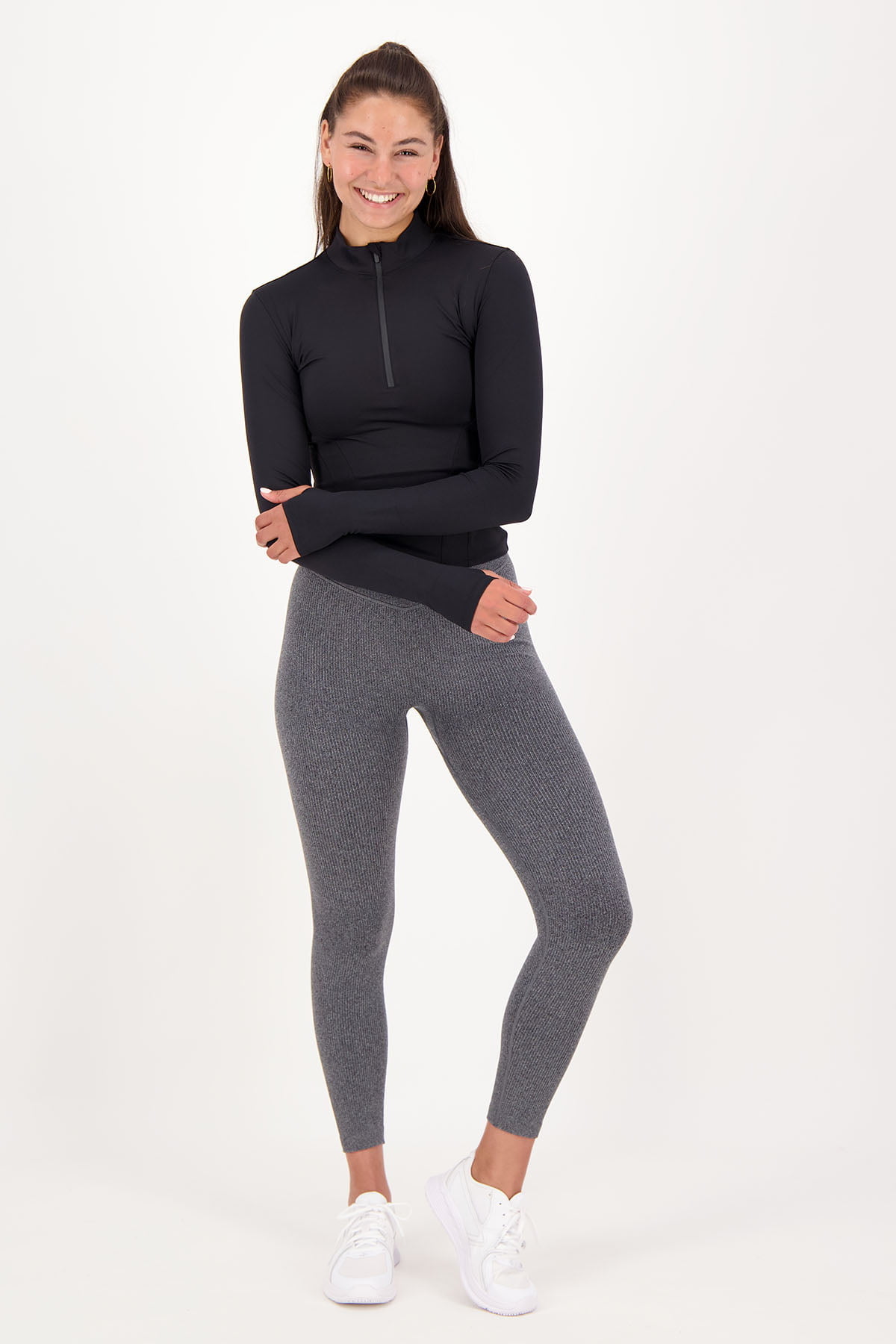 Ce haut sportif à manches longues avec fermeture à glissière ¼ au niveau du cou convient pour une bonne séance d'entraînement de course à pied ou d'autres sports de plein air. La fermeture éclair est munie d'un capuchon de protection en tissu qui empêche la fermeture éclair de frotter au niveau du cou/de la nuque. Le haut a des manches longues avec des ouvertures pour les pouces et est bien ajusté grâce aux belles lignes féminines sur le devant.