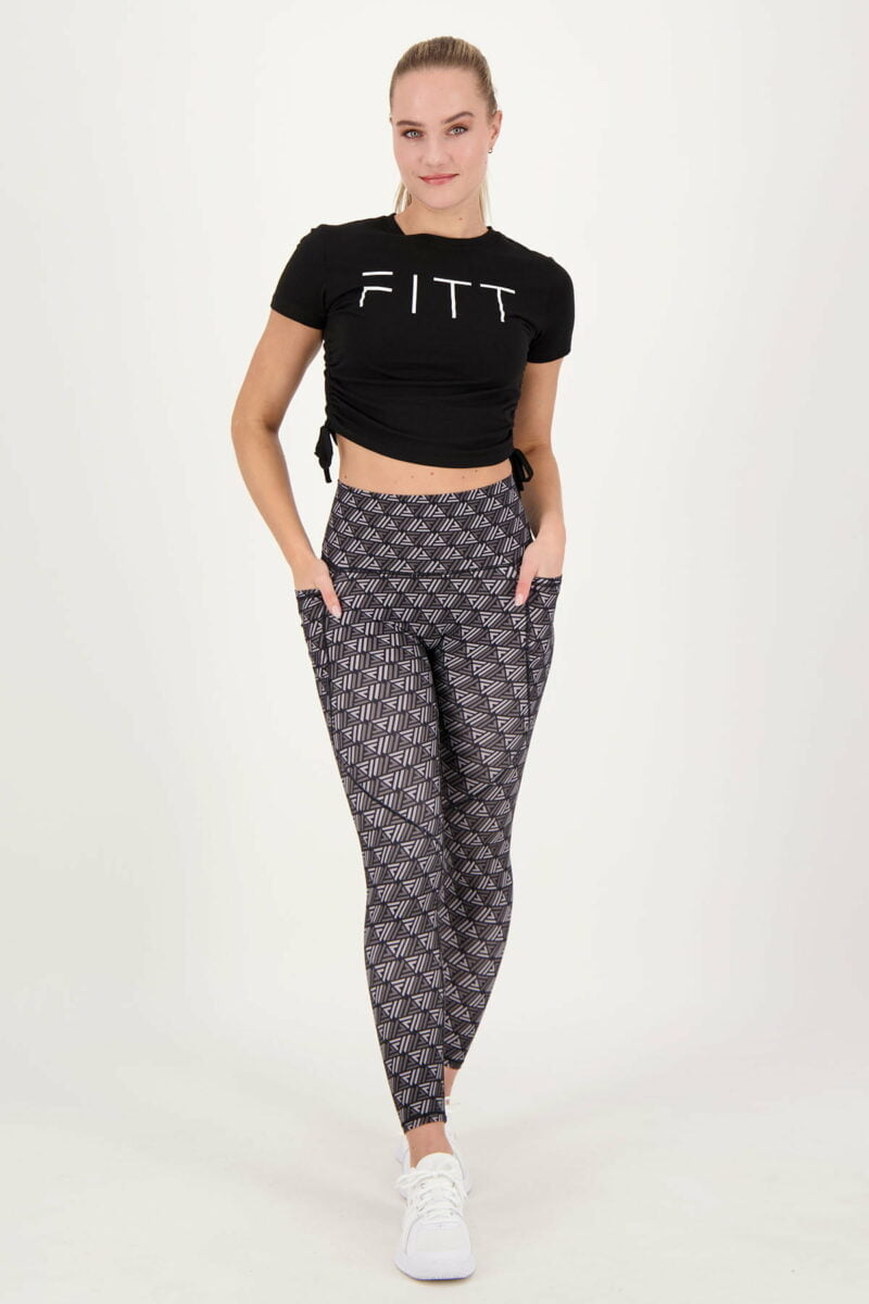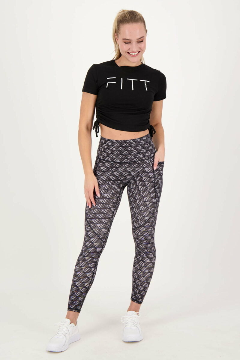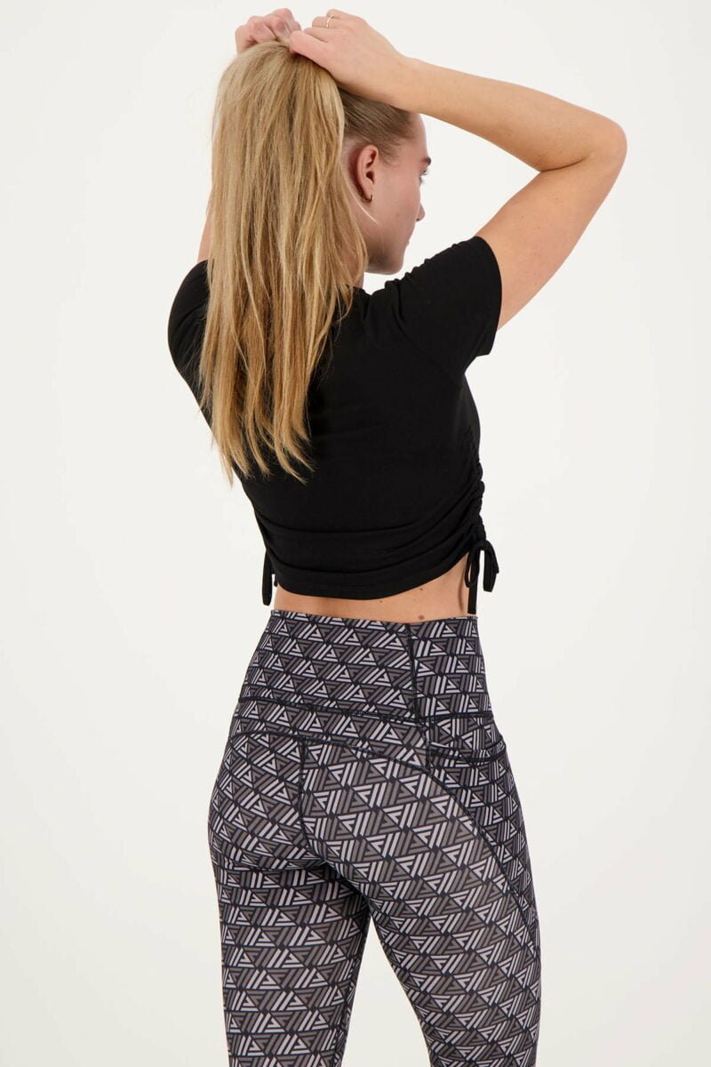 Le tee-shirt crop froncé est le vêtement athleisure essentiel. Suivez la tendance athleisure qui permet de porter des vêtements de sport et de détente dans la rue. Idéal comme haut de sport, ce t-shirt offre une grande liberté de mouvement et sa longueur est ajustable grâce aux volants. Portez-la comme bon vous semble ! L'associerez-vous à un legging, un jogging ou un short de sport ?