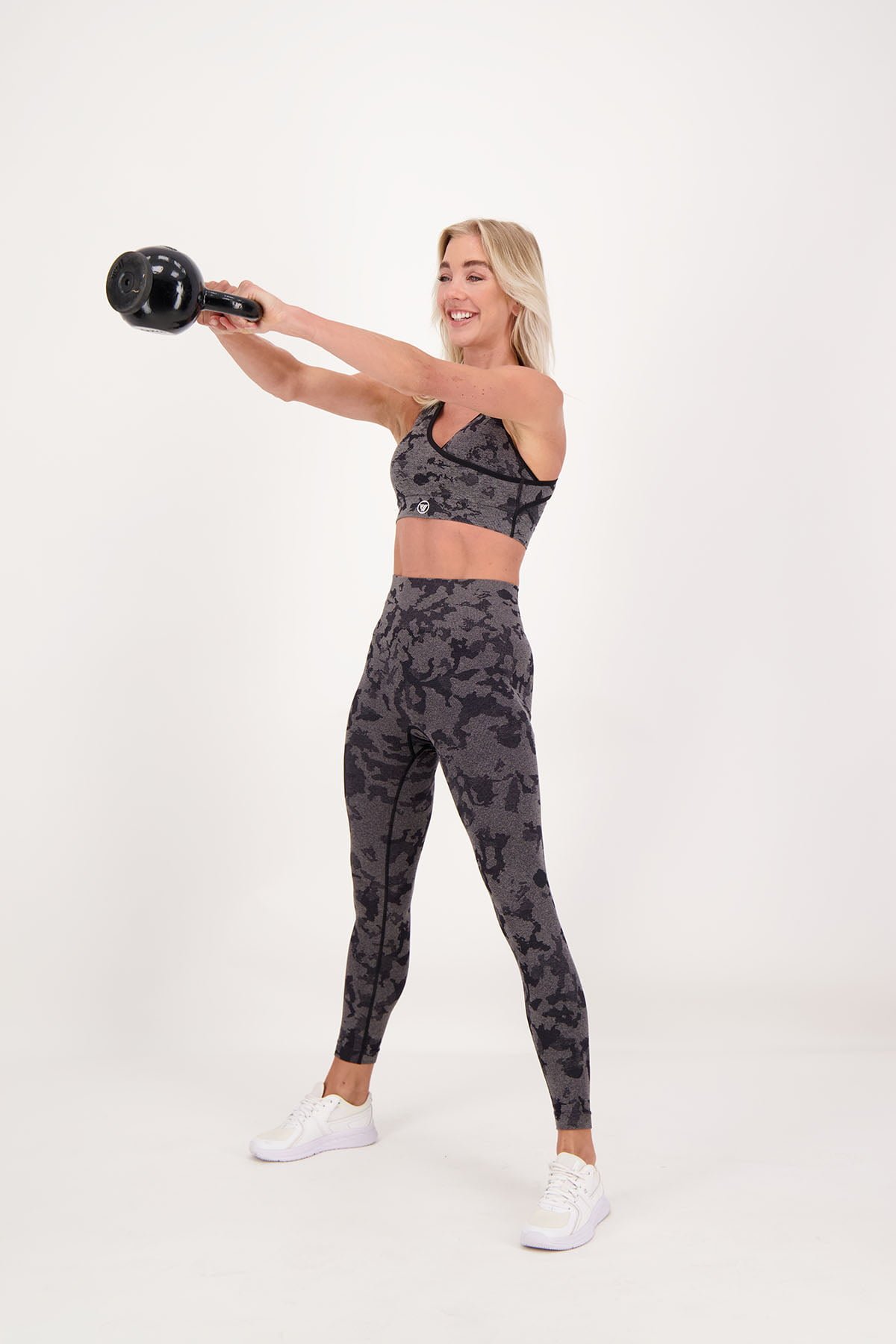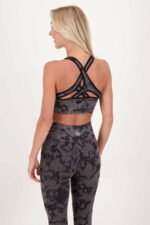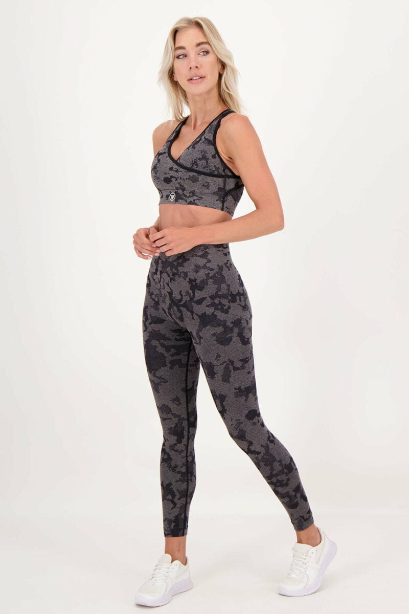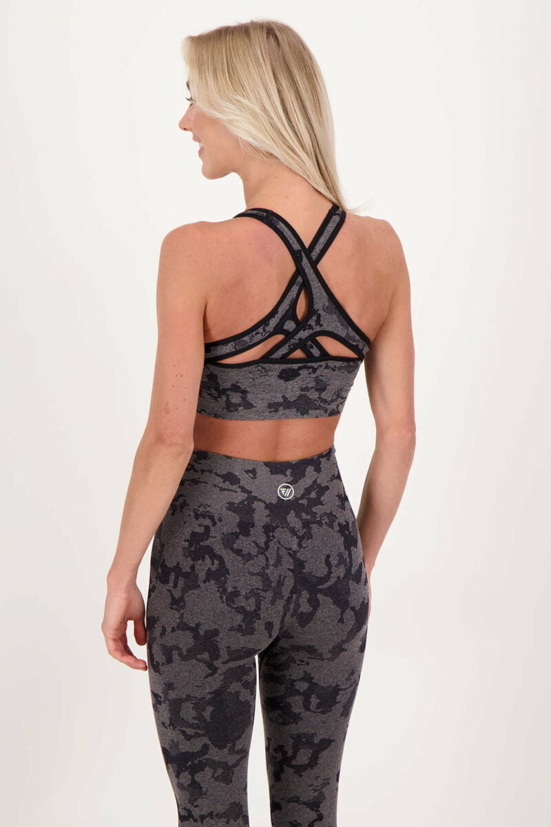 High impact sport BH met een all-over jacquard camouflageprint in verschillende toffe kleuren! Gekruisde banden en het overslag detail aan de voorzijde zorgen voor toffe details in deze BH. De stof is zweetafvoerend en dus ideaal voor elke workout.