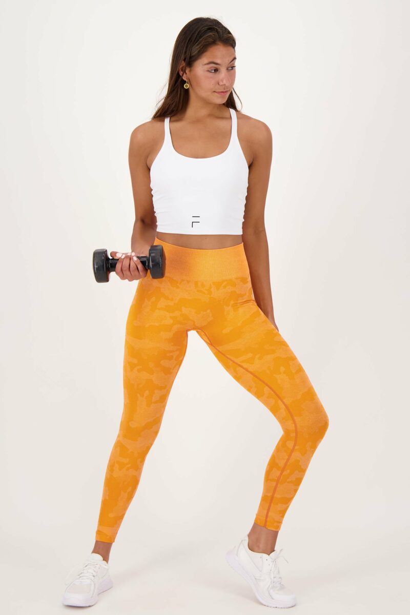 Opzoek naar een kleurrijke en stoere sportlegging? Dan is de camo seamless legging echt iets voor jou! De legging is gemaakt van een zacht en stretchy materiaal waardoor hij zal aanvoelen als een second skin. Door de geribbelde highwaist band zal hij elke pittige workout doorstaan. De legging is volledig squatproof en heeft een geborduurd FITT logo. Beschikbaar in meerdere trendy kleuren!