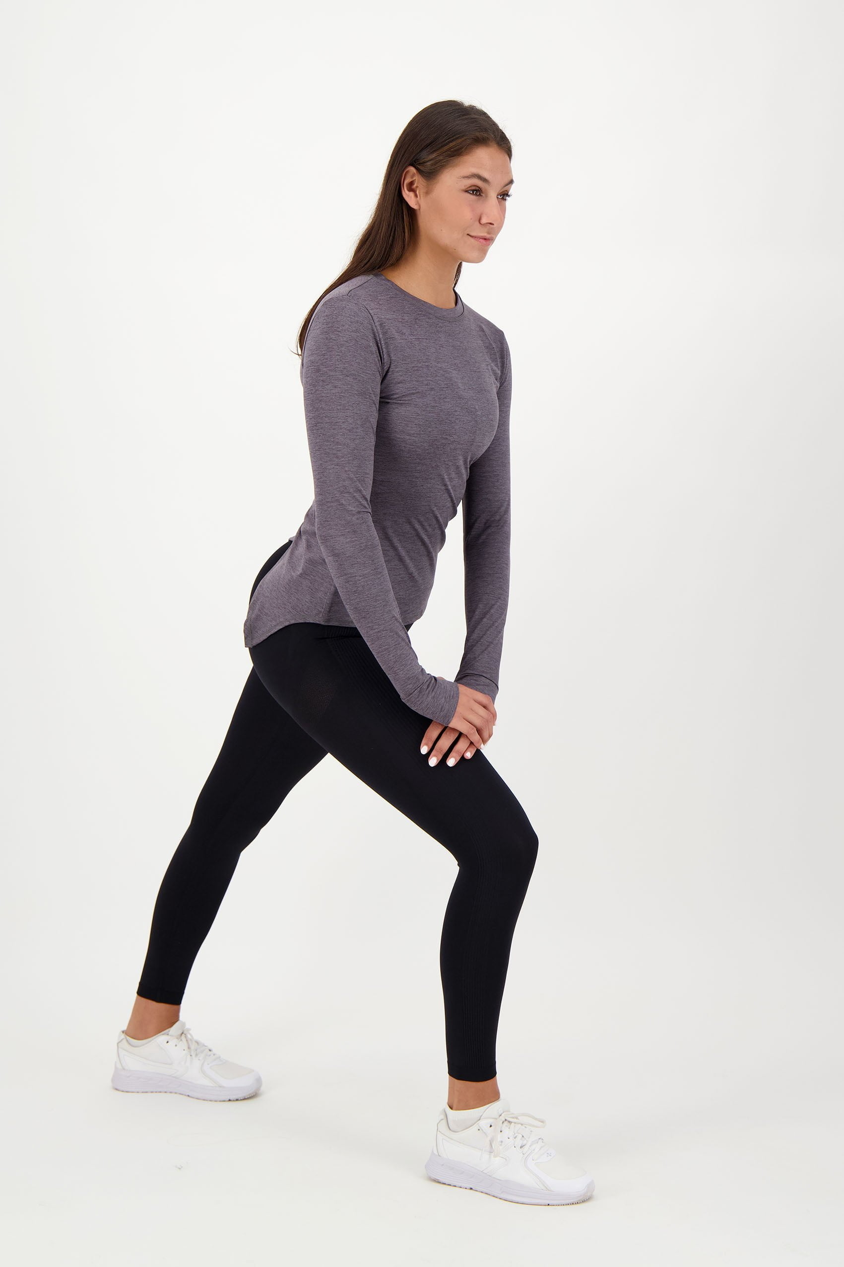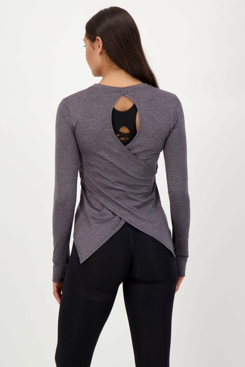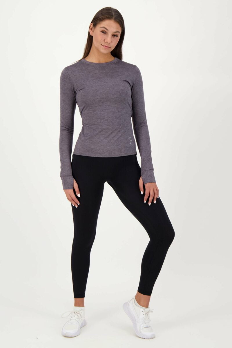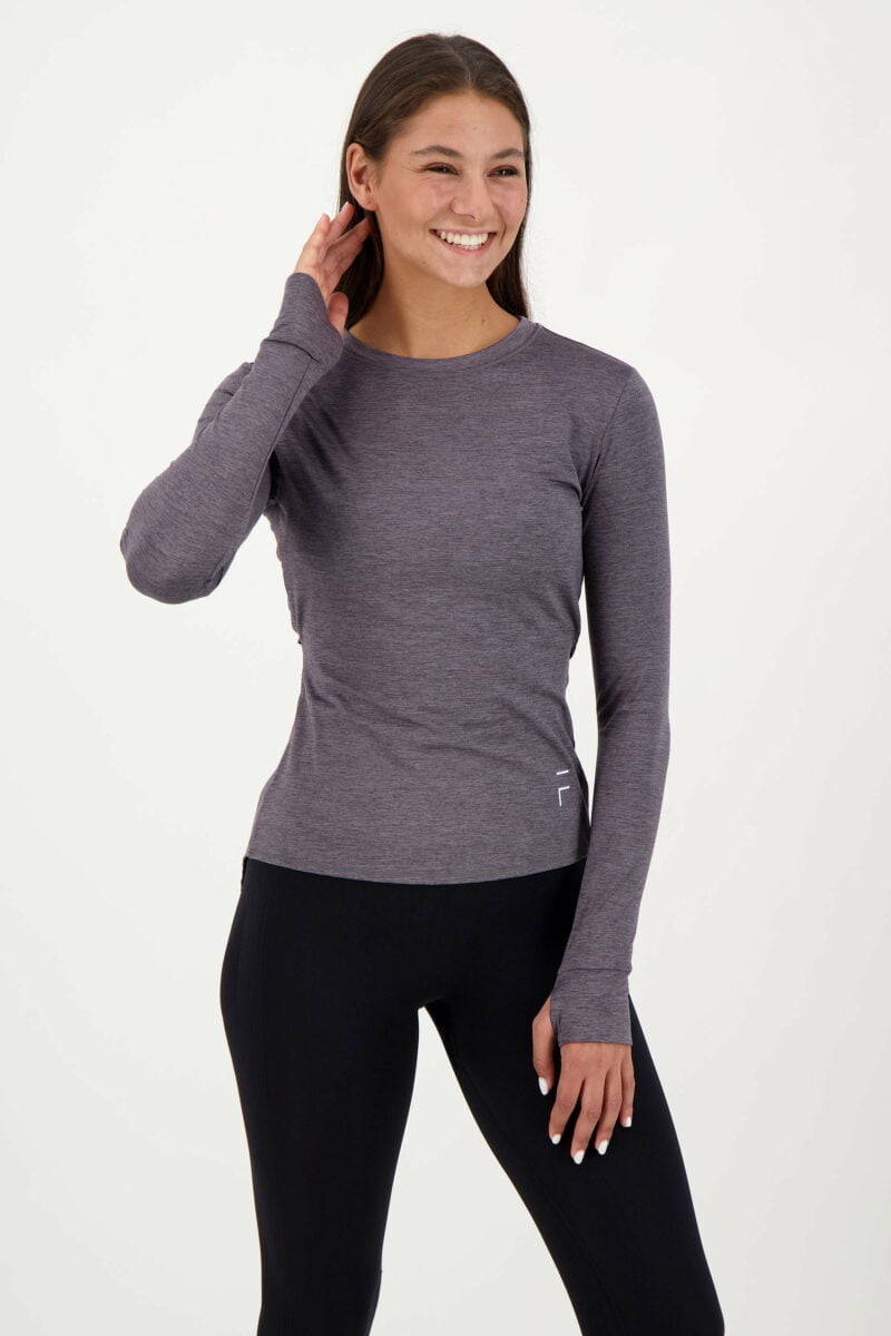 Trotseer de kou tijdens buiten sporten met deze warme en stevige top met lange mouwen. De top is voorzien van duimgaten en heeft een unieke achterzijde met een open detail op de rug. De gemêleerde stof geeft mooie kleuren weer. Feel Great, Perform Better!