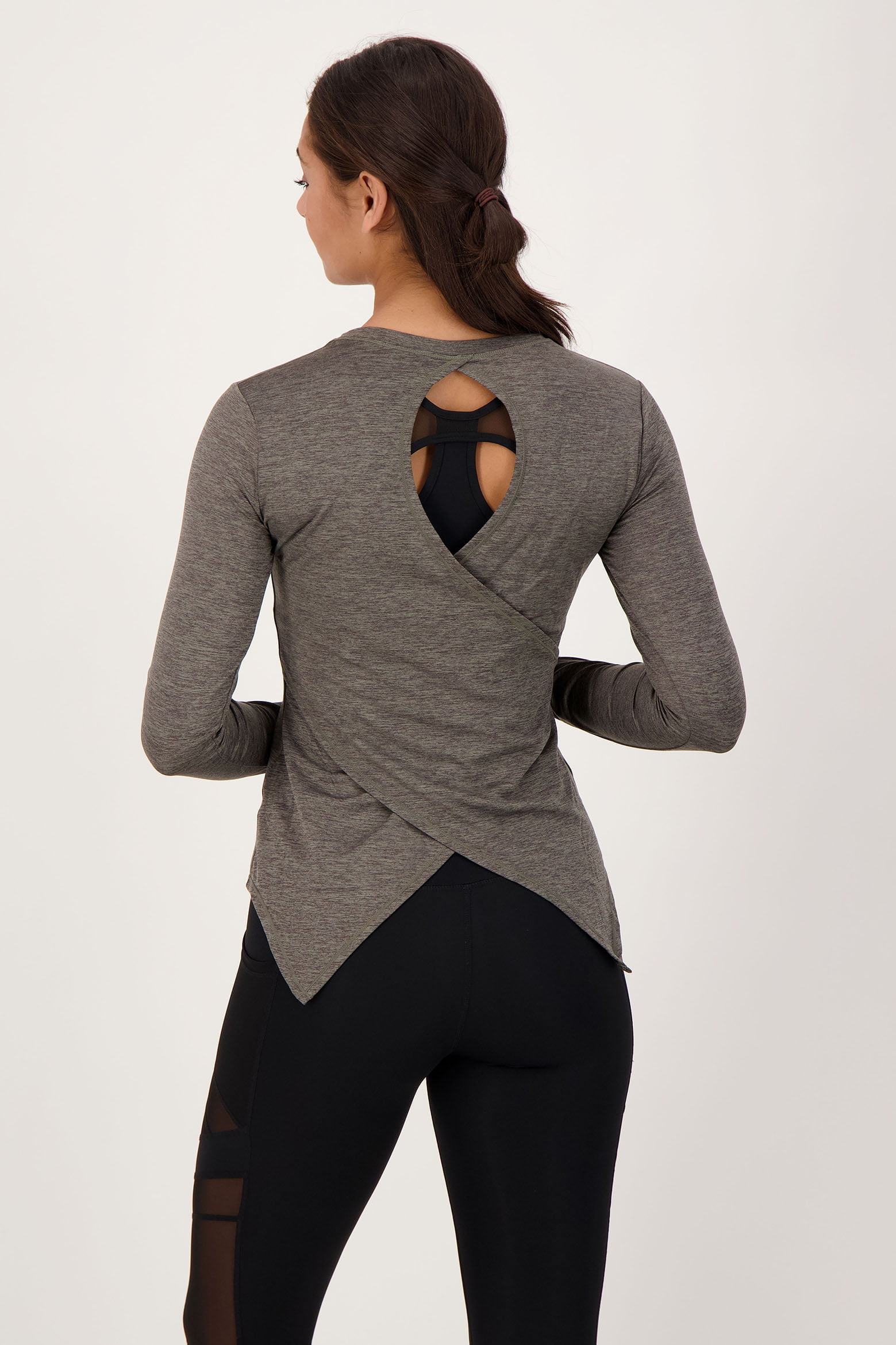Trotseer de kou tijdens buiten sporten met deze warme en stevige top met lange mouwen. De top is voorzien van duimgaten en heeft een unieke achterzijde met een open detail op de rug. De gemêleerde stof geeft mooie kleuren weer. Feel Great, Perform Better!