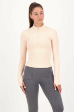 Deze sportieve top met lange mouwen en ¼ ritssluiting bij de hals is geschikt voor een goede harlooptraining of andere buitensporten. Bij de rits zit een stoffen beschermkapje waardoor de rits niet schuurt in de hals/nek. De top is voorzien van lange mouwen met duimopeningen en heeft een mooie pasvorm dankzij de mooie vrouwelijke belijningen aan de voorzijde.